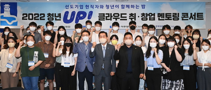 이재준 경기 수원시장이 6일 ‘2022년 청년UP 클라우드 취·창업 멘토링 콘서트’에 참여했다. 행사는 김지윤 DISNEY(디즈니) 경영지원 매니저, 윤덕원 삼성전자 전 부장의 강연 및 취창업 패널토론 등으로 진행됐다. 사진은 이 시장(앞줄 가운데)이 행사에 참여한 청년들과 단체촬영을 하는 모습. (사진제공=수원시청)