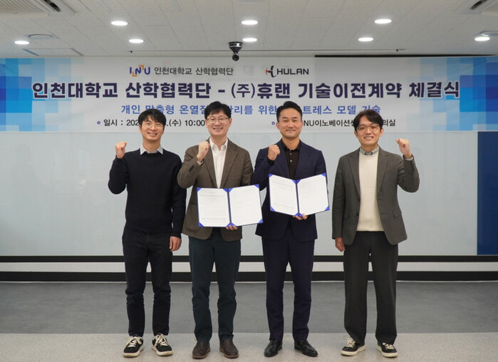 인천대 산학협력단(단장 강동구)은 11월 26일 도시건축학부 구충완 교수 연구팀이 개발한 '열 스트레스 모니터링 시스템 및 그 동작 방법' 관련 특허 4건과 노하우 기술 1건 등 총 5건의 기술을 휴랜(대표 김춘상)에 1억 원 규모로 이전하는 계약을 체결했다.