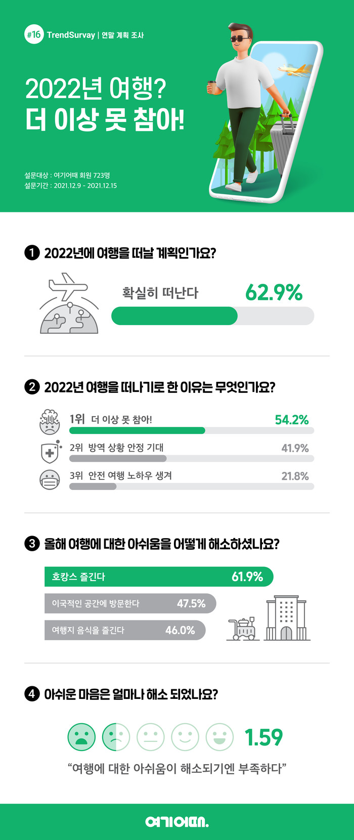 대한민국 대표 종합 숙박ㆍ액티비티 플랫폼 여기어때(대표 정명훈)의 설문조사 결과, 응답자의 62.9%가 내년에는 '무조건 여행을 떠나겠다'고 답했다. 새해 여행을 마음먹은 이유는 절반이 넘는 54.2%가 ‘더 이상 참기 어렵다’고 답해, 오래 지속된 코로나19 사태에 지친 심리 상태가 반영된 것으로 해석된다. 이외에도 앱 이용자들은 ‘방역 상황이 안정될 것을 기대해서(41.9%)’, ‘안정 여행 노하우가 생겨서(21.8%)’ 등을 이유로 여행을 준비 중이라고 답했다.