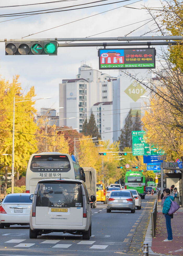 | ▲ 과속차량의 속도와 번호를 표출해 규정속도 준수를 독려하는 양천구 스마트 안전횡단 솔루션. (사진=양천구청 제공) |
