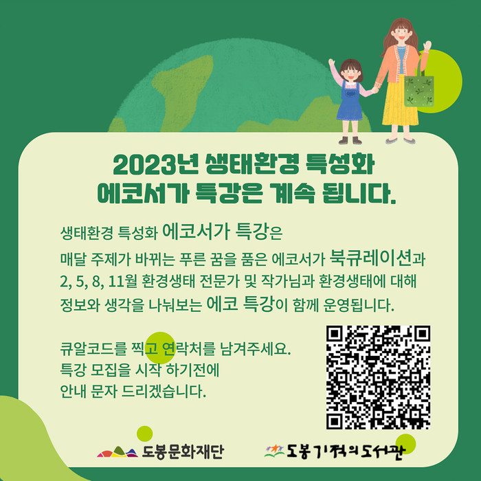 [시민일보 = 박준우 기자] 도봉구(구청장 오언석)는 도봉기적의 도서관에서 생태환경 관련 전문가의 강의를 듣고, 함께 대화를 나눌 수 있는 '에코서가 특강' 프로그램을 운영한다고 9일 밝혔다.