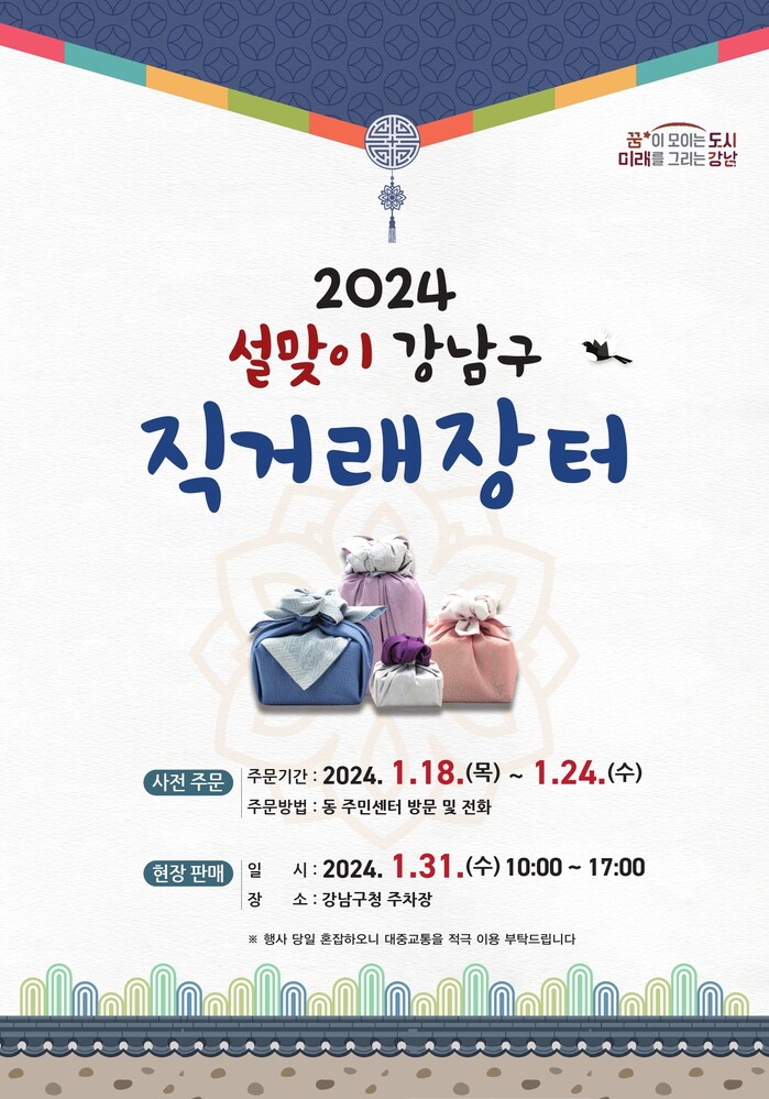 [시민일보 = 이대우 기자] 서울 강남구(구청장 조성명)가 설 명절을 맞아 오는 31일 오전 10시부터 오후 5시까지 구청 주차장에서 ‘설맞이 농축수산물 직거래 장터’를 연다.