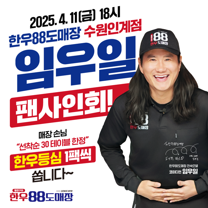 이어 “사인회 당일 수원인계점 매장 이용 고객에 한하여 선착순으로 증정되는 100% 1등급 한우 등심 증정 이벤트도 진행할 예정이니 많은 관심과 방문 부탁드린다”라며 “앞으로도 임우일과 함께 재밌는 이벤트를 기획해 나가겠다”라고 덧붙였다.