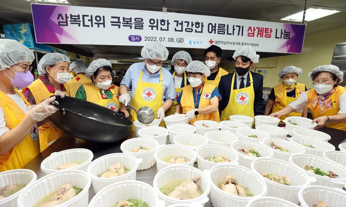 | ▲ 박 구청장이 지난 7월8일 서울 남부적십자사 봉사관에서 관내 한부모가정, 조손가정등 취약계층에 전달할 삼계탕을 담고 있다.(사진제공=동작구청) |