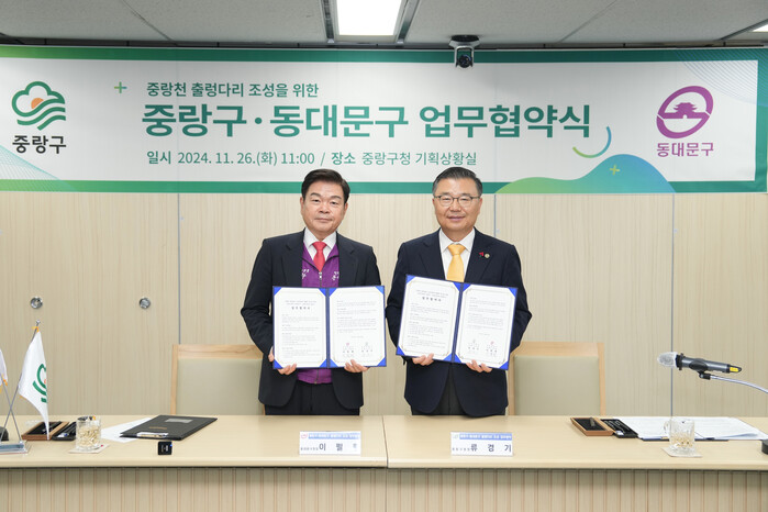구에 따르면 26일 오전 중랑구청 기획상황실에서 진행된 협약식에는 류경기 중랑구청장과 이필형 동대문구청장을 비롯해 양쪽 구 관계자 10여명이 참석했다.