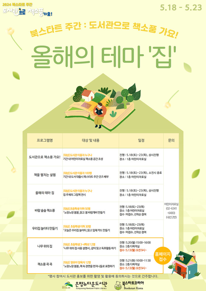 행사 기간 동안 1층 어린이자료실에 특별한 책소풍 공간을 조성하고, 책 대출 시 특별 제작된 북스타트 주간 굿즈를 제공한다. 또한 집을 주제로 한 그림책 전시와 함께, 선정된 도서를 읽고 참여할 수 있는 다양한 창의적 활동을 마련했다.