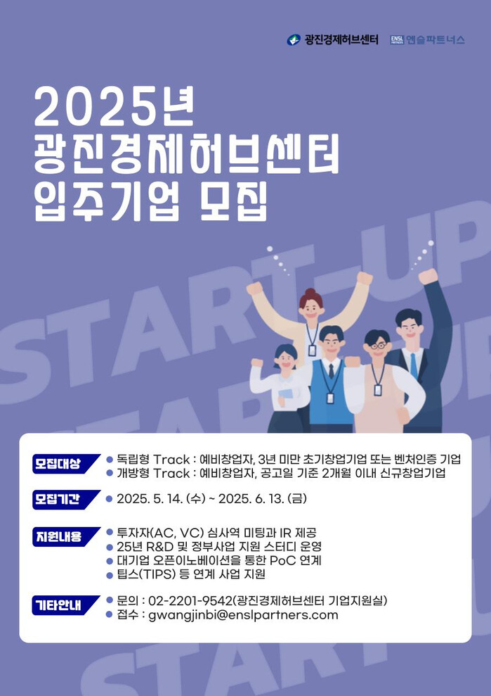 신청을 희망하는 기업은 6월13일까지 신청 서류를 구비해 전자우편(gwangjinbi@enslpartners.com)으로 제출하면 된다. 자세한 내용은 구청 또는 엔슬파트너스 누리집을 참고하거나, 광진경제허브센터 기업지원실로 문의하면 된다.
