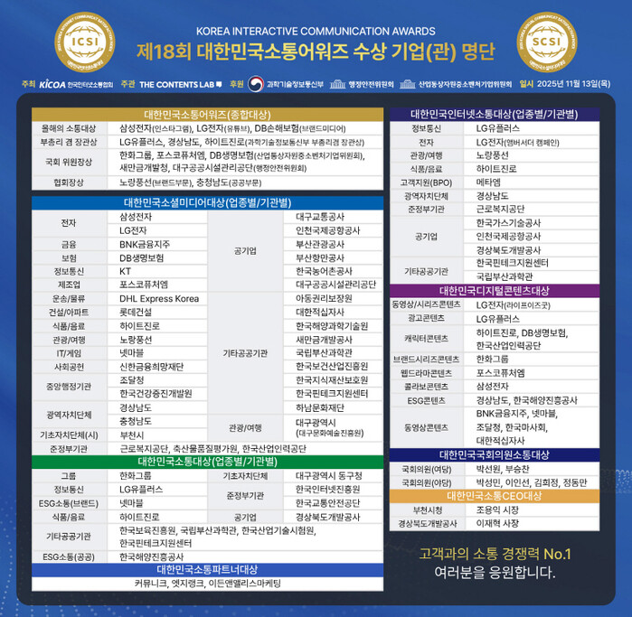 (사)한국인터넷소통협회(회장 박영락)가 지난 11월 13일 프레스센터에서 ‘제18회 대한민국소통어워즈 시상식’을 열고 고객과 소통을 잘하는 기업(관)을 발표했다. 시상식은 과학기술정보통신부와 국회 산자위, 행안위 등이 후원했다.
