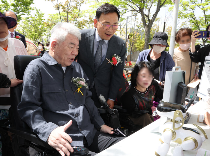 | ▲ 체험부스에서 구민들과 함께 스마트 홈케어 체험을 하는 조성명 강남구청 (사진=강남구청 제공) |