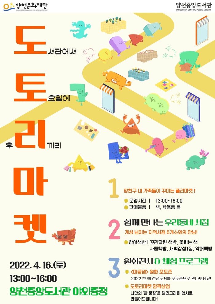 [시민일보 = 박준우 기자] 서울 양천구(구청장 김수영)는 봄을 맞아 오는 16일 양천중앙도서관 중정에서 '도토리마켓(도서관에서 토요일에 우리끼리 마켓)'을 개최한다.