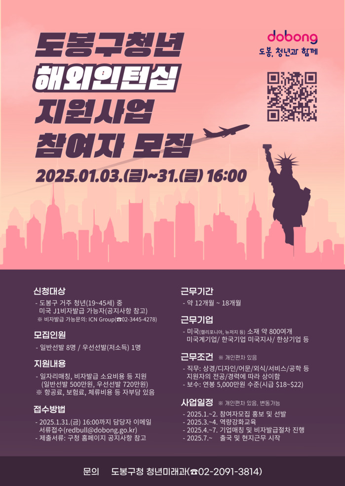 2023년부터 시행한 도봉 청년 해외인턴십은 미국 등 해외에서 인턴십 경험을 원하는 지역내 청년을 대상으로 전공과 직무를 고려, 해외인턴십 전문업체와 협력해 해외 소재 기업과 일자리를 연계해주는 사업이다.