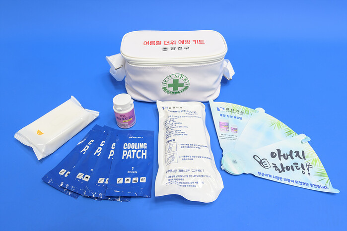 | ▲ 새벽인력시장 건설근로자에게 배부하는 ‘온열질환 예방키트’. (사진=양천구청 제공) |