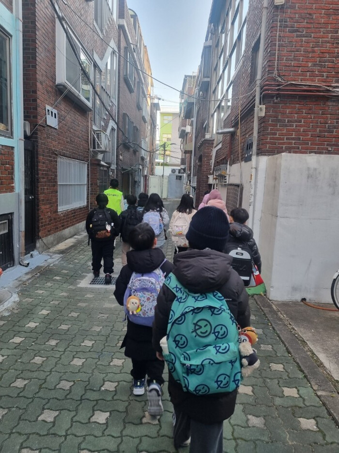 | ▲ 성동구 워킹스쿨버스 교통안전지도사가 아이들의 등·하굣길을 동행하는 모습. (사진=성동구청 제공) |