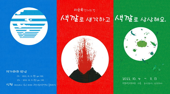 ‘색깔로 생각하고 색깔로 상상해요’라는 주제로 열리는 이번 전시회는 이순옥 작가의 대표작《하늘 조각》과《초록초록》,《빨강》등 그림책 작품을 선보인다.