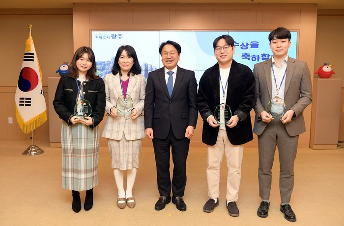 [광주=정찬남 기자] 광주광역시(시장 강기정)는 ‘11월의 공무원’으로 법무담당관 규제개혁팀 김주연·이미라 주무관과 체육진흥과 체육시설팀 이승민·김성수 주무관을 선정하고 6일 시청 비즈니스룸에서 시상했다.