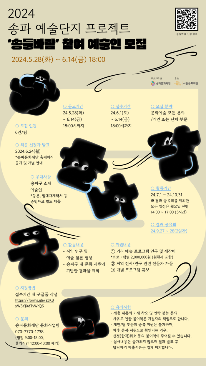 [시민일보 = 이대우 기자] 재단법인 송파문화재단은 28일부터 6월14일까지 2024 예술단지 프로젝트 ‘송들바람’에 참여할 예술인과 예술단체를 모집한다.