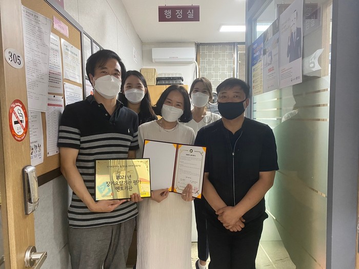 | ▲ 방문3천사 재가요양센터의 2021년 장기요양기관 평가 멘토기관 선정식, 함은미 동양실버요양보호사교육원 원장(중앙), 손경우 A방문3천사 방문요양센터 대표(좌측 첫번째)가 기념촬영을 하고 있다. (사진제공=동양실버요양보호사교육원) |