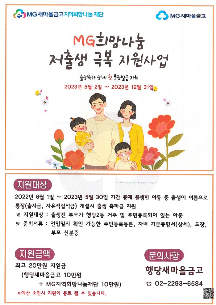 이번 협약에 따라 행당새마을금고는 자녀 출생 전 부모가 행당제2동에 거주 및 주민등록되어 있고, 2023년 6월 1일부터 2024년 5월 31일 기간 중 출생한 자녀의 ‘출생축하통장’(출자금, 자유적립금)을 개설하게 되면 20만 원의 출생축하금을 지원받는다.