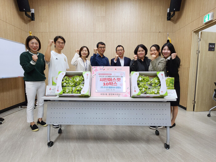 경기 오산시 대원2동 행정복지센터는 14일 (주)주윤 김병노 총괄이사로부터 샤인머스캣 10상자를 기탁받았다고 밝혔다.