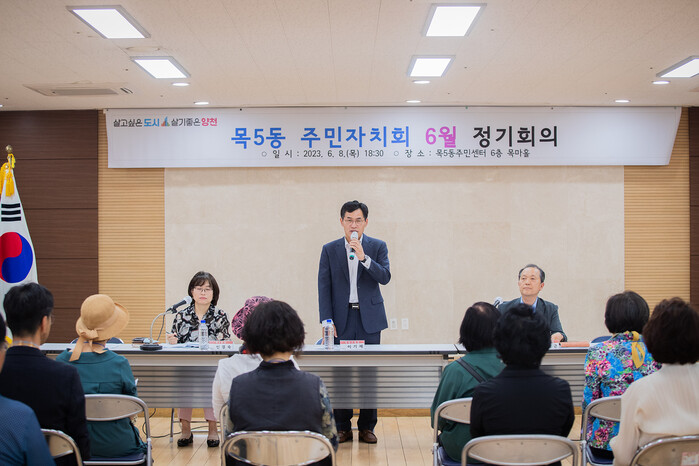 | ▲ 지난 6월 열린 목5동 주민자치회 정기회의에서 위원들과 소통중인 이기재 양천구청장. (사진=양천구청 제공) |