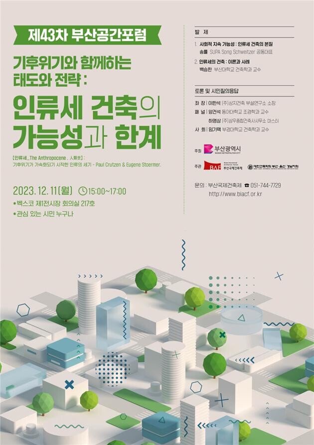 이번 포럼은 '기후 위기와 함께하는 태도와 전략 : 인류세* 건축의 가능성과 한계'를 주제로 산업계, 학계 등 전문가들이 한자리에 모여 변화하는 환경에 대응하는 지속 가능한 건축에 대해 발제와 토론을 펼칠 예정이다.