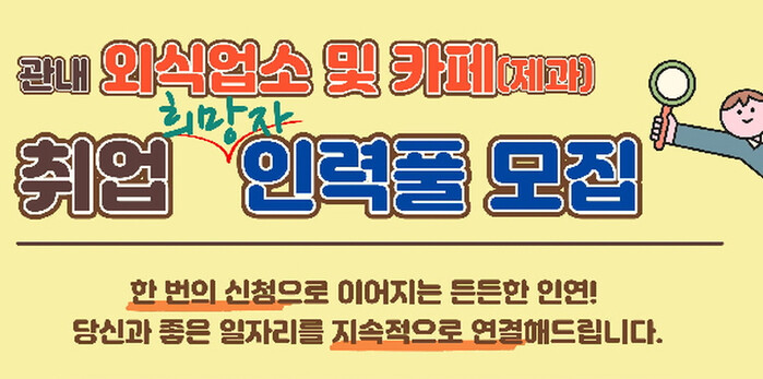 이와 함께 상시로 관내 외식 업소 및 카페(제과)의 구인 신청을 접수해 현장 인력 수요에 맞는 인재를 신속하게 연결해 필요한 시기에 적합한 인력을 신속하게 채용할 수 있도록 지원할 예정이다.