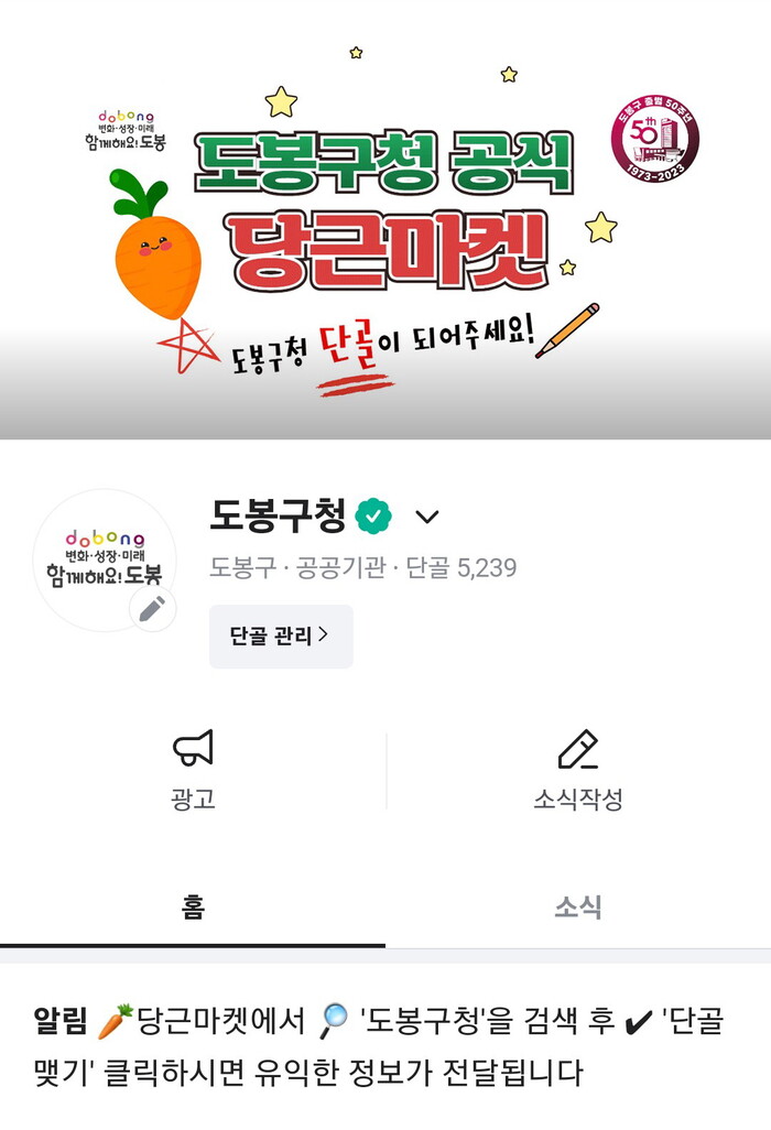| ▲ 도봉구 당근마켓 홍보채널 메인화면. |