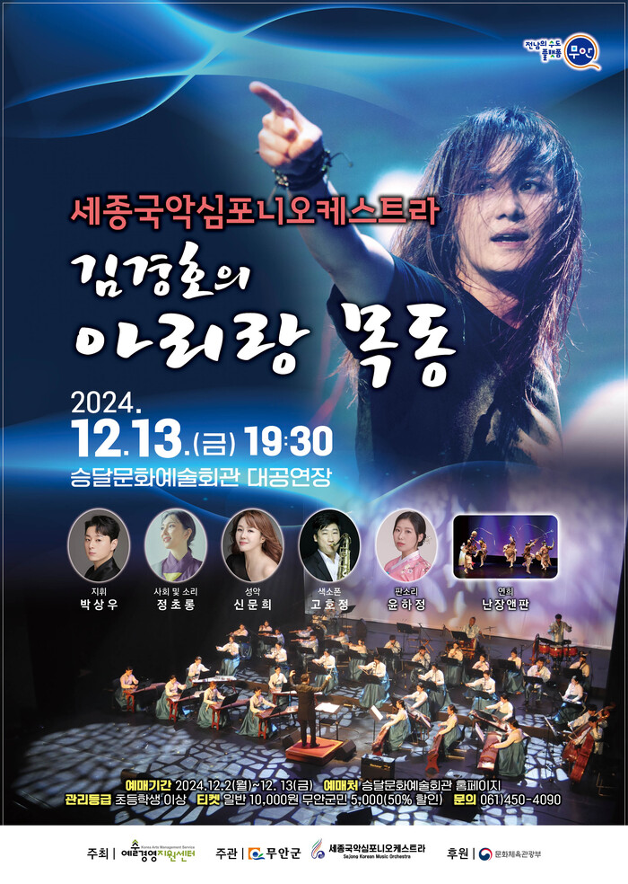 [무안=황승순 기자]전남 무안군(군수 김산)은 2024 공연예술유통사업에 선정된 특별 공연 ‘세종국악심포니오케스트라 & 김경호의 아리랑목동’을 오는 12월 13일(금) 저녁 7시 30분 승달문화예술회관 대공연장에서 개최한다.