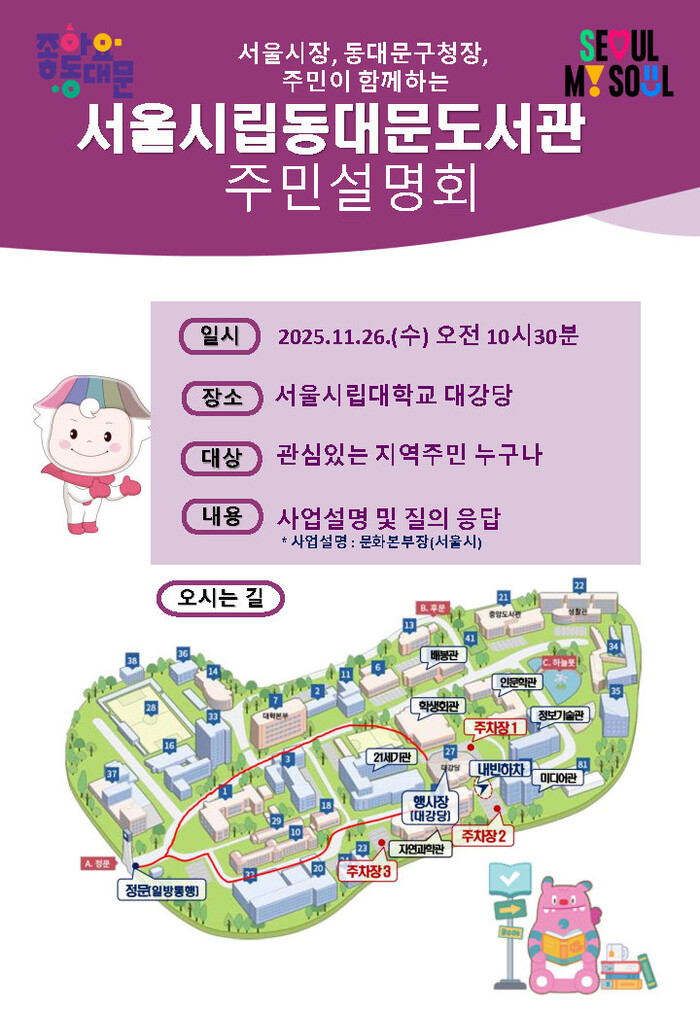 [시민일보 = 이대우 기자] 동대문구(구청장 이필형)는 26일 오전 10시, 서울시립대학교 대강당에서 ‘서울시립동대문도서관 건립 주민설명회’를 개최한다고 밝혔다.