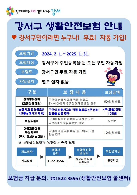 진교훈 구청장은 “일상 속에서 발생하는 예상치 못한 사고가 생각보다 많다”며 “올해 2월1일 이후 사고를 당한 구민들께서는 강서구 생활안전보험을 꼭 활용해 지원을 받으시길 바란다”고 전했다.