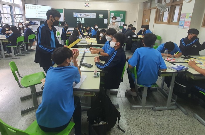 경기 의정부시 마을·사회적경제지원센터는 최근 호원중학교 학생 30여명을 대상으로 '2022년 사회적경제 청소년 아카데미-청사진' 4차시 대면 수업을 진행했다. 수업은 학교생활을 하면서 해결해보고 싶은 문제를 발굴 및 해결하는 방법을 워크숍 형태로 진행했다. 사진은 워크숍이 진행되고 있는 모습. (사진제공=의정부시청)