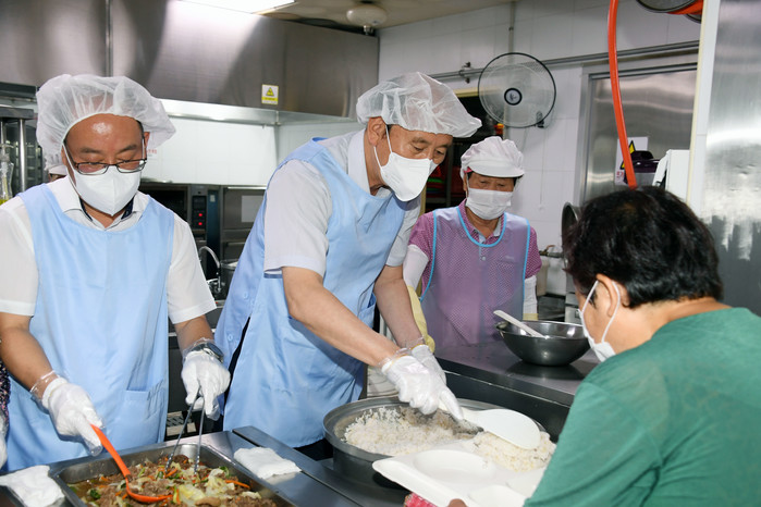 박형덕 경기 동두천시장은 27일 부인 하미순씨와 함께 동두천시노인복지관을 이용하는 노인들을 대상으로 점심 배식 봉사활동을 펼쳤다. 사진은 박 시장(가운데)이 노인복지관에서 국과 반찬을 배식하고 있는 모습. (사진제공=동두천시청)