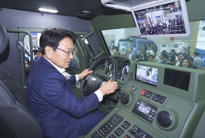 | ▲ 강기정 광주광역시장이 27일 오후 서구 김대중컨벤션센터에서 열린 '2024 광주미래산업엑스포 개막식'에 참석해 수출용 장갑차량 내부를 살펴보고 있다./광주광역시 제공 |