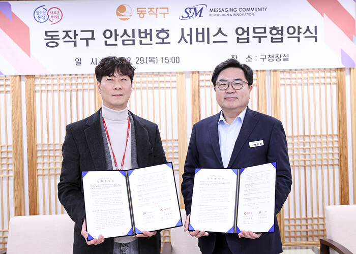 | ▲ 동작구청에서 개최된 동작구-(주)에스엠티엔티 간 ‘동작구 안심번호 서비스 업무협약식’에서 박일하 구청장(오른쪽)이 협약서를 들고 기념 촬영을 하고 있다. (사진=동작구청 제공) |