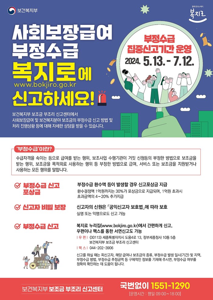 복지 예산이 꾸준히 증가함에 따라 부정수급으로 인한 재정누수 예방의 중요성이 더욱 강조되고 있다. 이에 집중 신고 기간 운영으로 부정수급 행위를 적발할 예정이다.