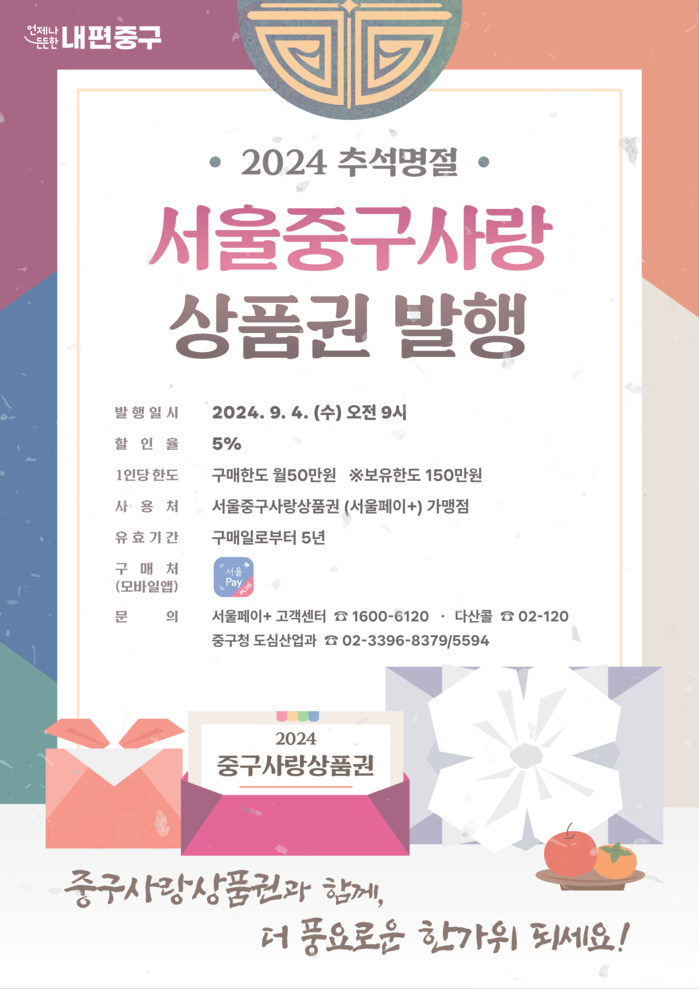 [시민일보 = 여영준 기자] 서울 중구가 추석 명절을 맞아 오는 9월4일 오전 9시부터 ‘서울중구사랑상품권’을 발행한다고 밝혔다.