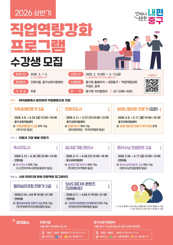 [시민일보 = 여영준 기자] 서울 중구는 오는 3~5월 운영하는 직업역량강화 프로그램 상반기 과정에 수강생 160명을 모집한다고 밝혔다.