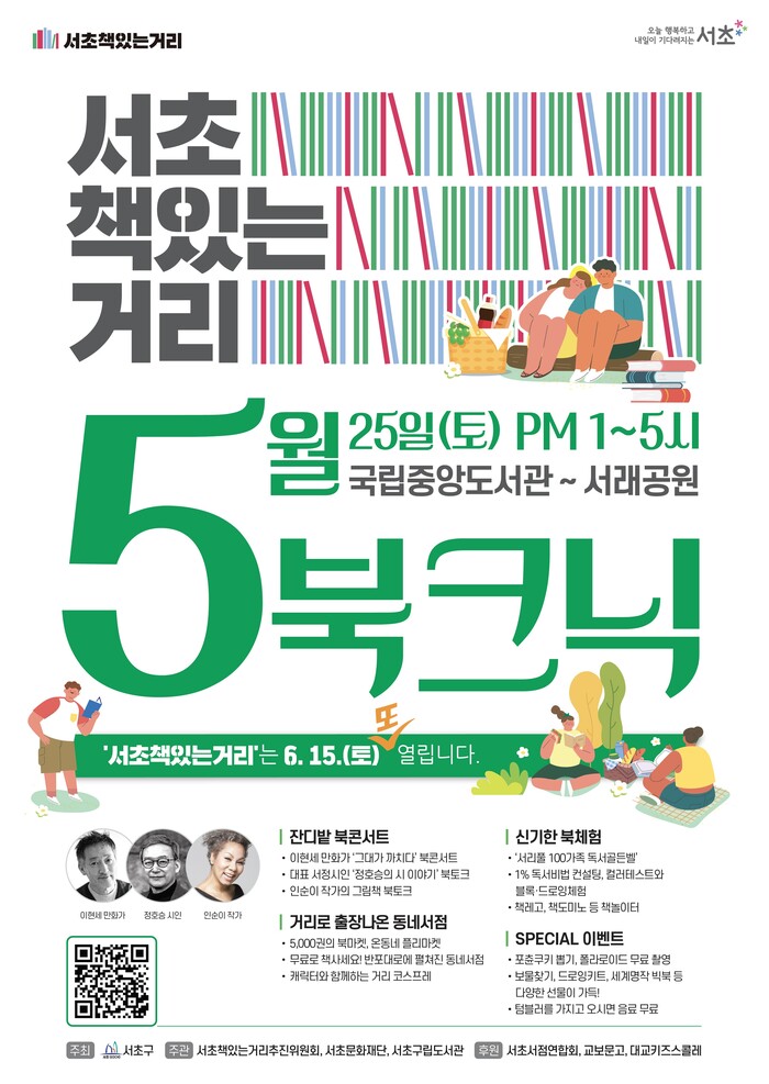 [시민일보 = 이대우 기자] 서초구(구청장 전성수)가 오는 25일 오후 1시부터 서초책있는거리(국립중앙도서관~서래공원)에서 독서문화행사 ‘5월 북크닉’ 행사를 연다.