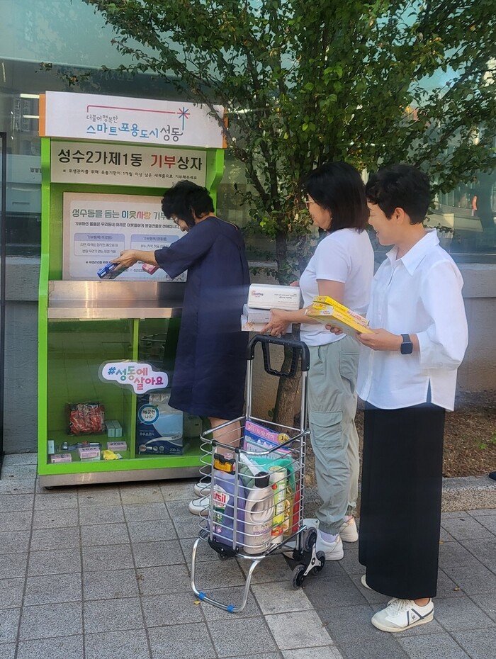 | ▲ 성수2가제1동 주민센터 앞에 마련된 기부상자에 기부하고 있는 모습 (사진=성동구청 제공) |