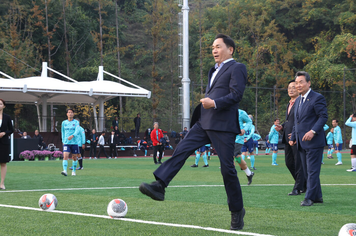 | ▲ 강남세곡체육공원 준공식에서 축구 시범을 보이는 조성명 강남구청장. (사진=강남구청 제공) |
