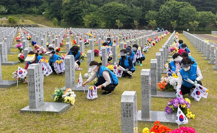 봉사자들은 순국 선열들이 잠들어 있는 묘비 옆에 태극기 851개를 꽂고 손수 비석을 닦으며 쓰레기들을 치우는 등 묘역정화 활동을 펼쳤다.