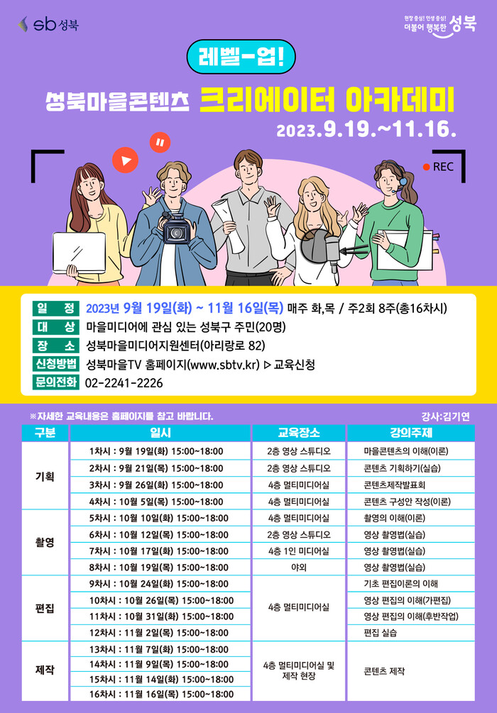 [시민일보 = 홍덕표 기자] 서울 성북구(구청장 이승로)가 마을 미디어 콘텐츠 제작 역량 강화를 위한 교육과정을 마련했다.