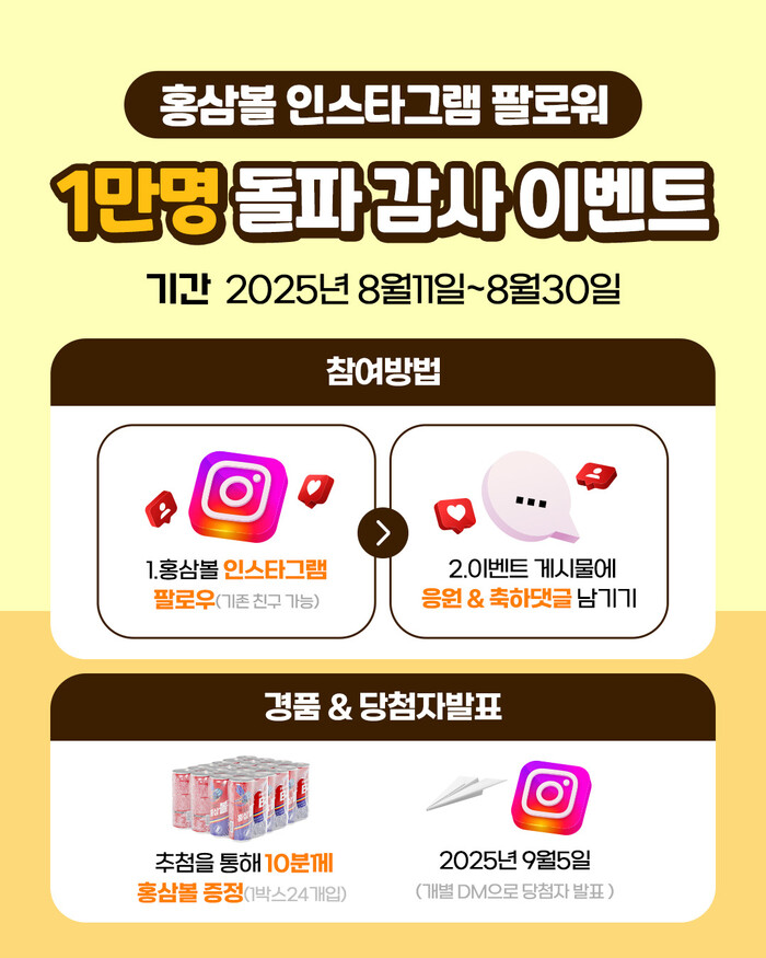 이 같은 성원에 보답하기 위해 ‘홍삼볼’은 오는 8월 30일까지 2주간 ‘팔로워 1만 명 돌파 기념 감사 이벤트’를 진행한다. 참여 방법은 인스타그램 이벤트 게시글에 축하 댓글을 남기고 팔로우 인증을 하면 된다. 누구나 쉽게 참여 가능하다.