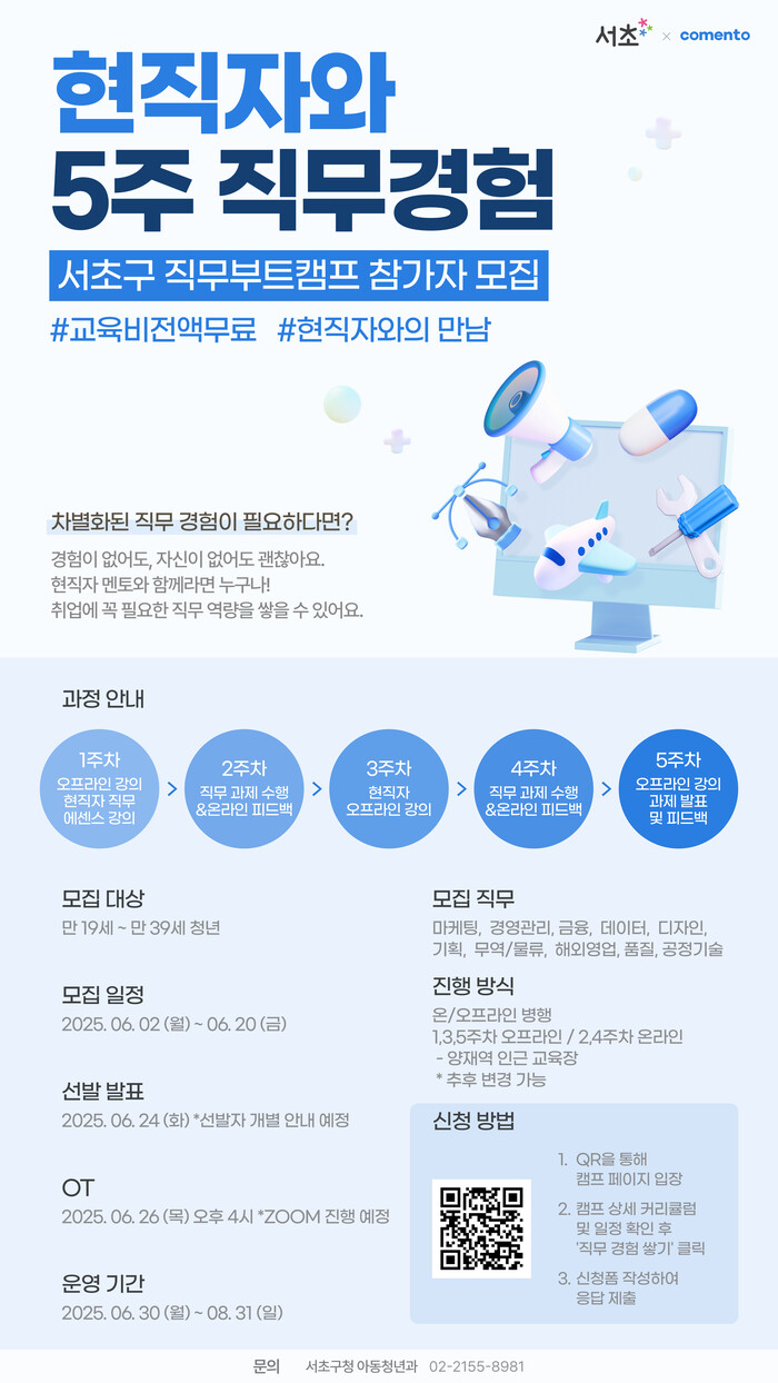 [시민일보 = 박소진 기자] 서초구(구청장 전성수)는 취업을 준비하는 청년들에게 든든한 힘이 되는 프로그램으로 ‘청년 직무캠프’와 ‘서류패스 멘토링’을 운영한다고 4일 밝혔다.