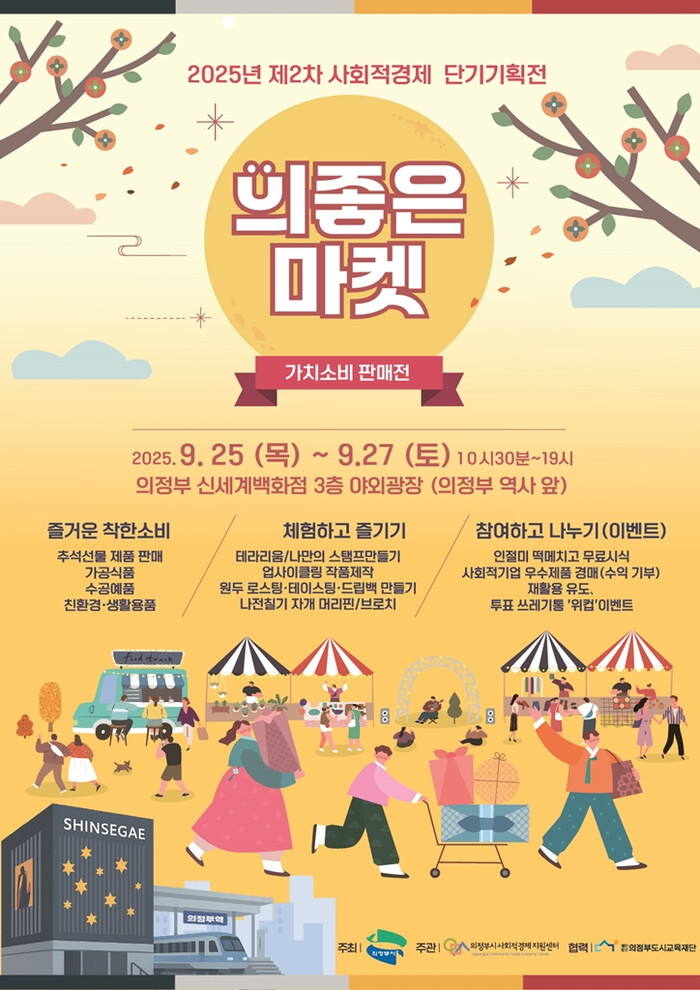 [시민일보 = 민장홍 기자] 경기 의정부시가 오는 25일부터 27일까지 3일간 신세계백화점 의정부점 야외광장 3층에서 2025년 제2차 사회적경제 단기기획전 ‘의좋은마켓’을 개최해 사회적경제기업의 판로 확대와 지역경제 활성화에 나선다.