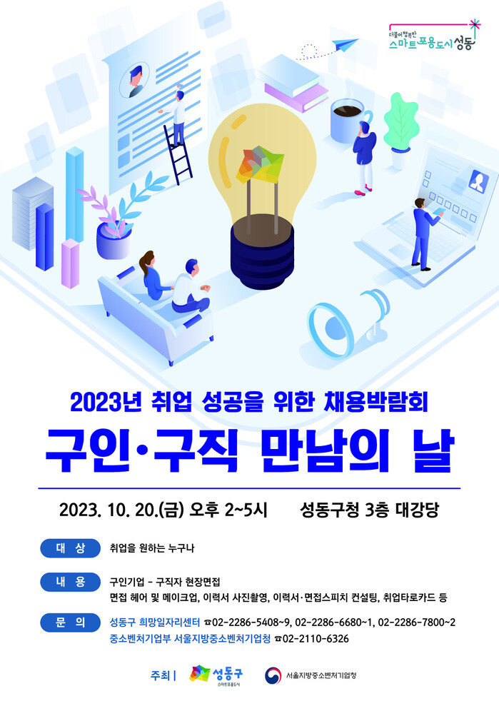 [시민일보 = 홍덕표 기자] 성동구(구청장 정원오)가 오는 20일 오후 2시부터 구청 3층 대강당에서 취업 성공을 위한 채용박람회 '구인·구직 만남의 날' 행사를 개최한다.