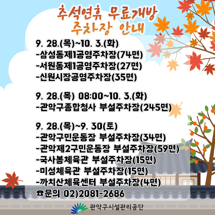 [시민일보 = 여영준 기자] 서울 관악구시설관리공단(이하 공단)이 주민과 방문객의 편의 제공과 지역경제 활성화 지원을 위해 추석 연휴기간 공영주차장 및 체육시설 부설주차장 등을 무료로 개방한다.