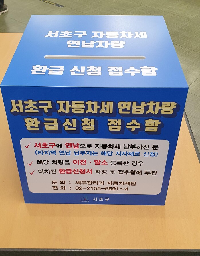 [시민일보 = 이대우 기자] 서울 서초구(구청장 전성수)가 차량 소유권 이전이나 폐차 말소하는 주민들이 사전 납부한 자동차세를 빠르고 편리하게 환급받을 수 있도록 올해부터 구청 내 차량등록민원실에 ‘연납자동차세 간편 환급접수함’을 운영한다.