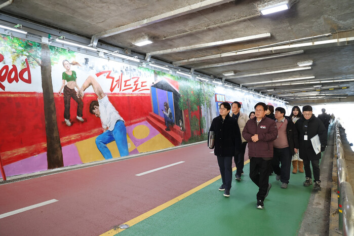 박강수 마포구청장은 최근 성산천 환경개선공사 및 생태경관 개선사업이 마무리된 성산천을 방문해 정비 상태를 점검했다. 사진은 박 구청장이 구 부서장들과 함께 성산천 일대를 둘러보는 모습. (사진=마포구청 제공)