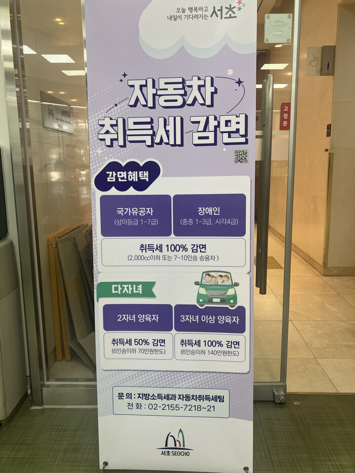 [시민일보 = 박소진 기자] 서초구(구청장 전성수)가 차량취득세 감면 대상자의 알권리를 강화하고 납세자의 불이익을 사전에 막기 위해 구청 1층 자동차등록 민원실 입구에 '차량취득세 감면 홍보 배너'를 설치하고 안내에 나선다고 밝혔다.